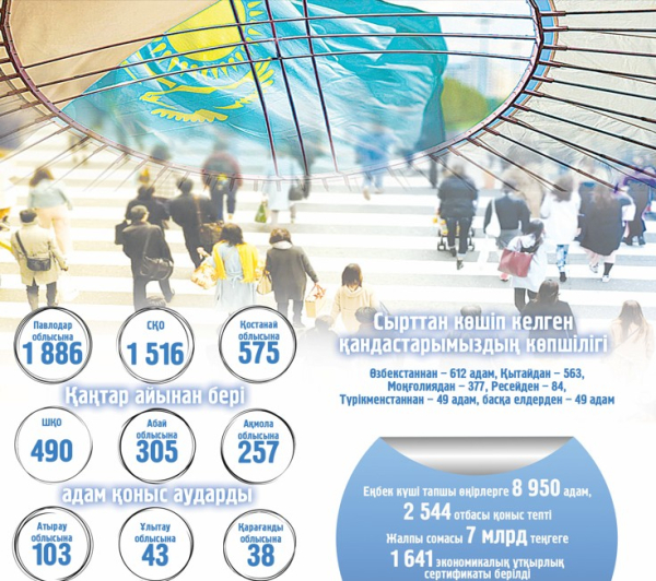 Еңбек және халықты әлеуметтік қорғау министрлігінің мәліметінше, биылғы тоғыз айда 5 213 адам жұмыс күшіне зәру облыстарға қоныс аударды. Оның ішінде 1 725 қандасымыз алыс-жақын елдерден көшіп келді. Жыл соңына дейін тағы 9 653 адамды көшіру жоспарланып отыр. Жыл басынан бері қоныс аударушыларға мемлекет тарапынан барлық қолдау шарасы көрсетілді. Қаңтар айынан бері Павлодар облысына – 1 886, СҚО – 1 516, Қостанай облысына – 575, ШҚО – 490, Абай облысына – 305, Ақмола облысына – 257, Атырау облысына – 103, Ұлытау облысына – 43, Қарағанды облысына 38 адам қоныс аударды. Қоныстану аймақтарына сырттан көшіп келген қандастарымыздың көпшілігі негізінен Өзбекстаннан – 612 адам, Қытайдан – 563, Моңғолиядан – 377, Ресейден – 84, Түрікменстаннан – 49 адам, басқа елдерден 49 адам атамекенге ат басын бұрды. Жұмыс күші тапшы өңірлерге қоныс аударғандар арасынан еңбекке жарамды 2 307 адамның 1 041-і жұмысқа орналасса, 38 адам жеке кәсіпкерлікті өрістетіп отыр.