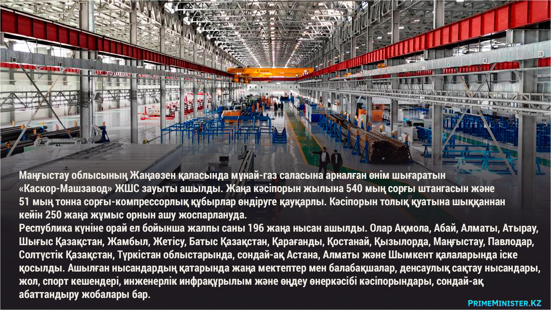 Республика күніне орай бүкіл еліміз бойынша ірі өнеркәсіптік кәсіпорындардан бастап әлеуметтік, спорттық және инфрақұрылымдық жобаларға дейін 196 жаңа нысан пайдалануға беріледі, деп жазады Egemen.kz.